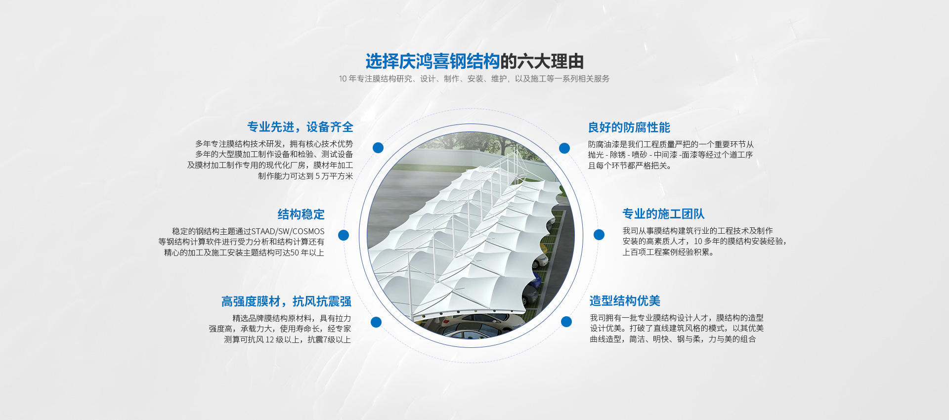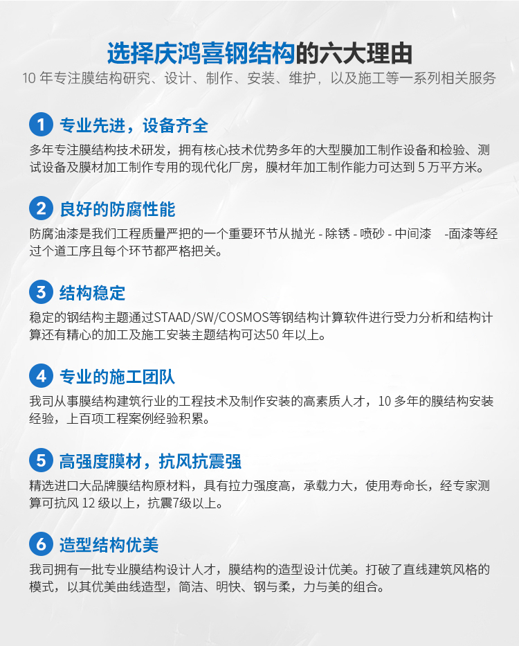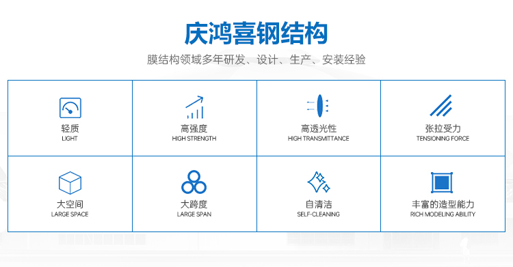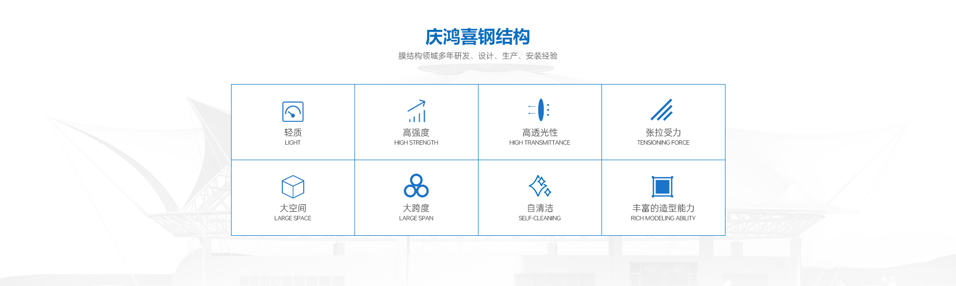 MORE+????????安徽省慶鴻喜鋼結(jié)構(gòu)有限公司是一家專業(yè)從事膜結(jié)構(gòu)工程的綜合性公司。公司秉承“信譽(yù)第一、質(zhì)量第一”的宗旨。開拓、發(fā)展、創(chuàng)新的理念。目前公司主營膜結(jié)構(gòu)設(shè)計(jì)、膜裁剪設(shè)計(jì)、膜材加工及鋼結(jié)構(gòu)安裝與維修。公司擁有一批國內(nèi)較早從事膜結(jié)構(gòu)行業(yè)的高素質(zhì)技術(shù)人員和安裝隊(duì)伍,擁有先進(jìn)的鋼膜設(shè)計(jì)軟件3D3S、forten32、和FSCAD,在設(shè)計(jì)上大膽創(chuàng)新,在加工上精益求精,在施工上安全認(rèn)證,在售后上讓客戶使用放心。
